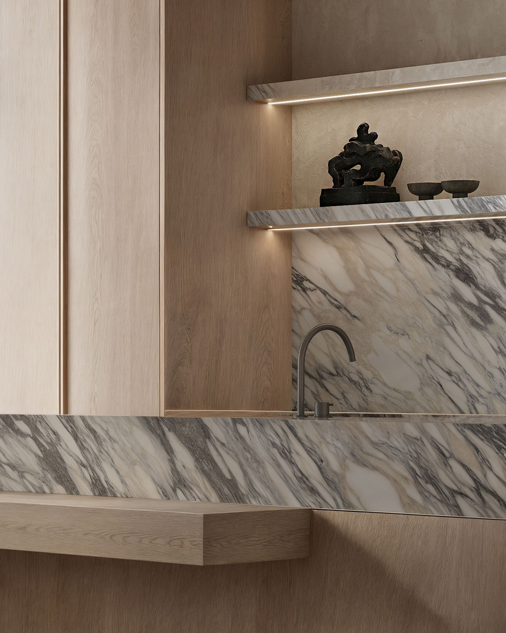 Decorative wall and ceiling moldings were carefully integrated throughout the apartment, giving the spaces their characteristic Parisian rhythm and depth. A chevron wooden floor further reinforces this timeless aesthetic, while bespoke furniture elements, including a custom-designed kitchen with marble worktops, add a layer of craftsmanship and refinement. Natural stone accents appear in several areas of the home, enriching the material palette. Linen curtains soften the natural light and made-to-measure glass doors allow daylight to travel gently through the apartment. Carefully selected furniture and styling complete the composition.